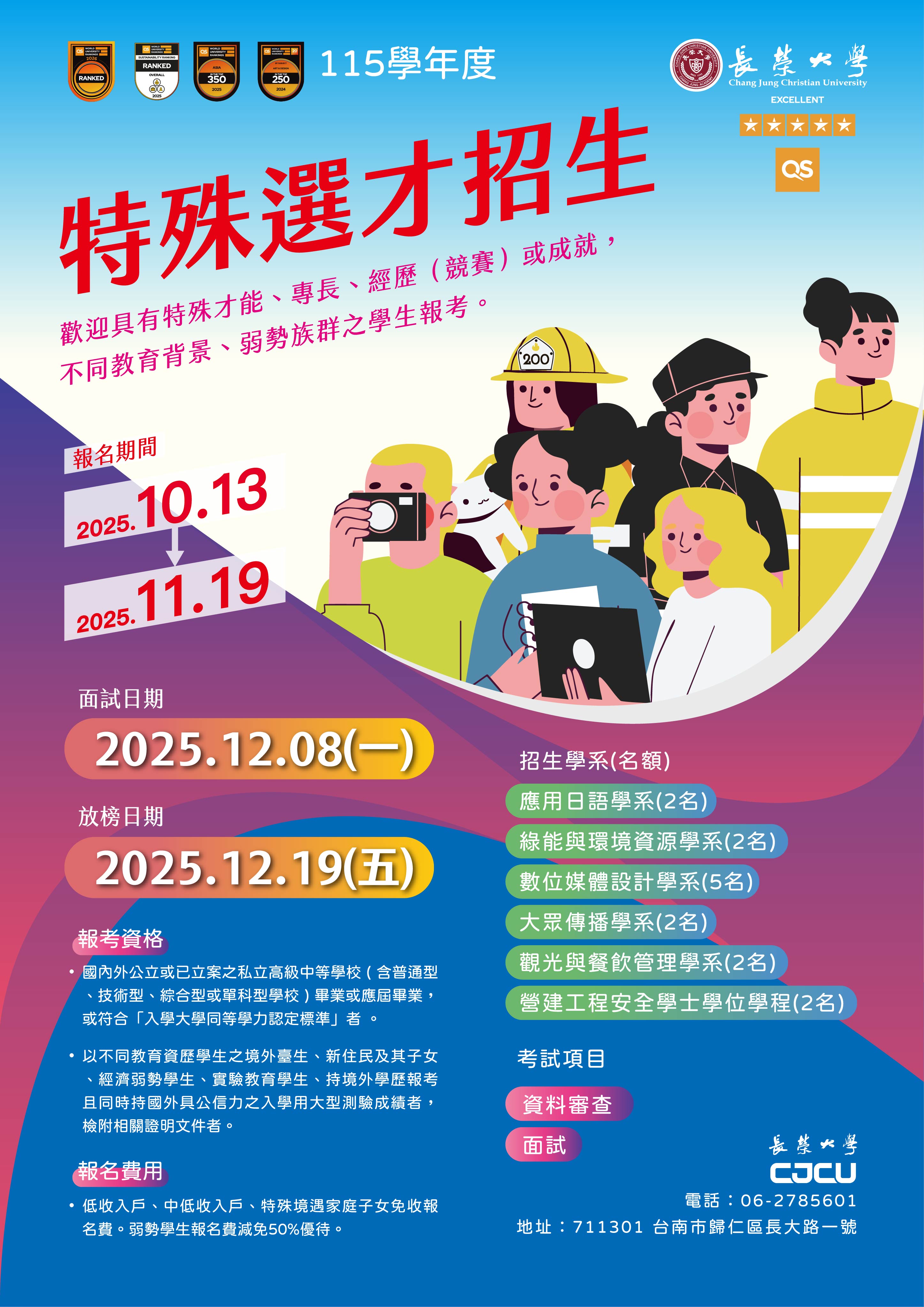 [特殊選才]長榮大學115學年度辦理特殊選才招生資訊