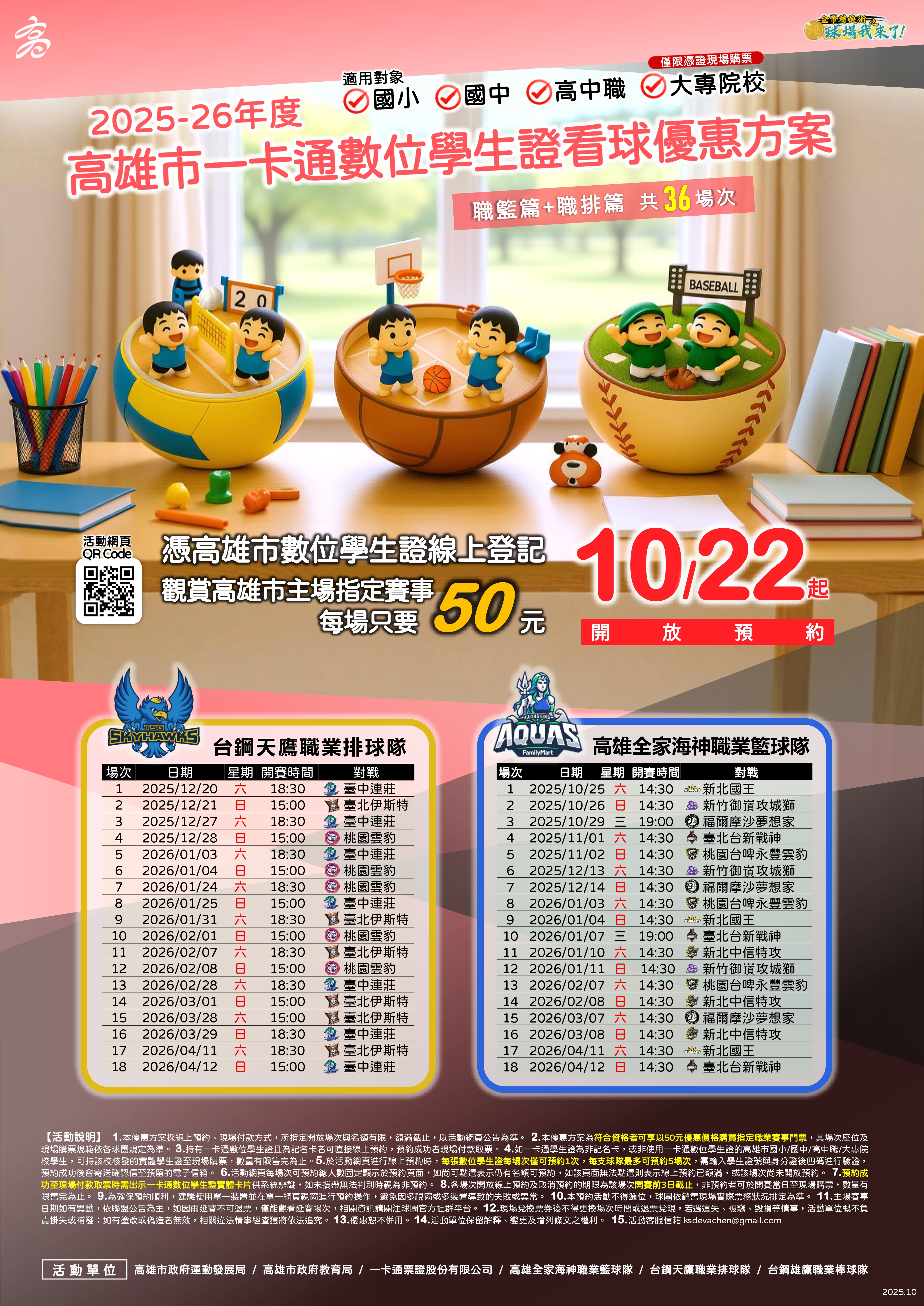 轉知高雄市政府教育局與運動發展局共同辦理「2025-26年度一卡通數位學 生證購票優惠活動」