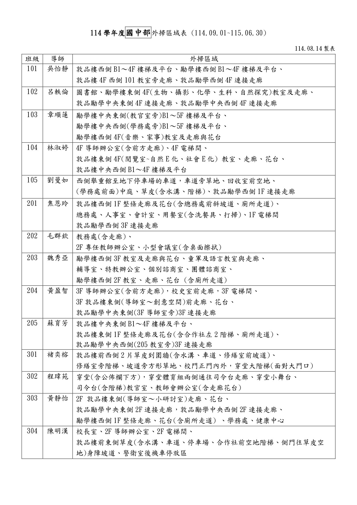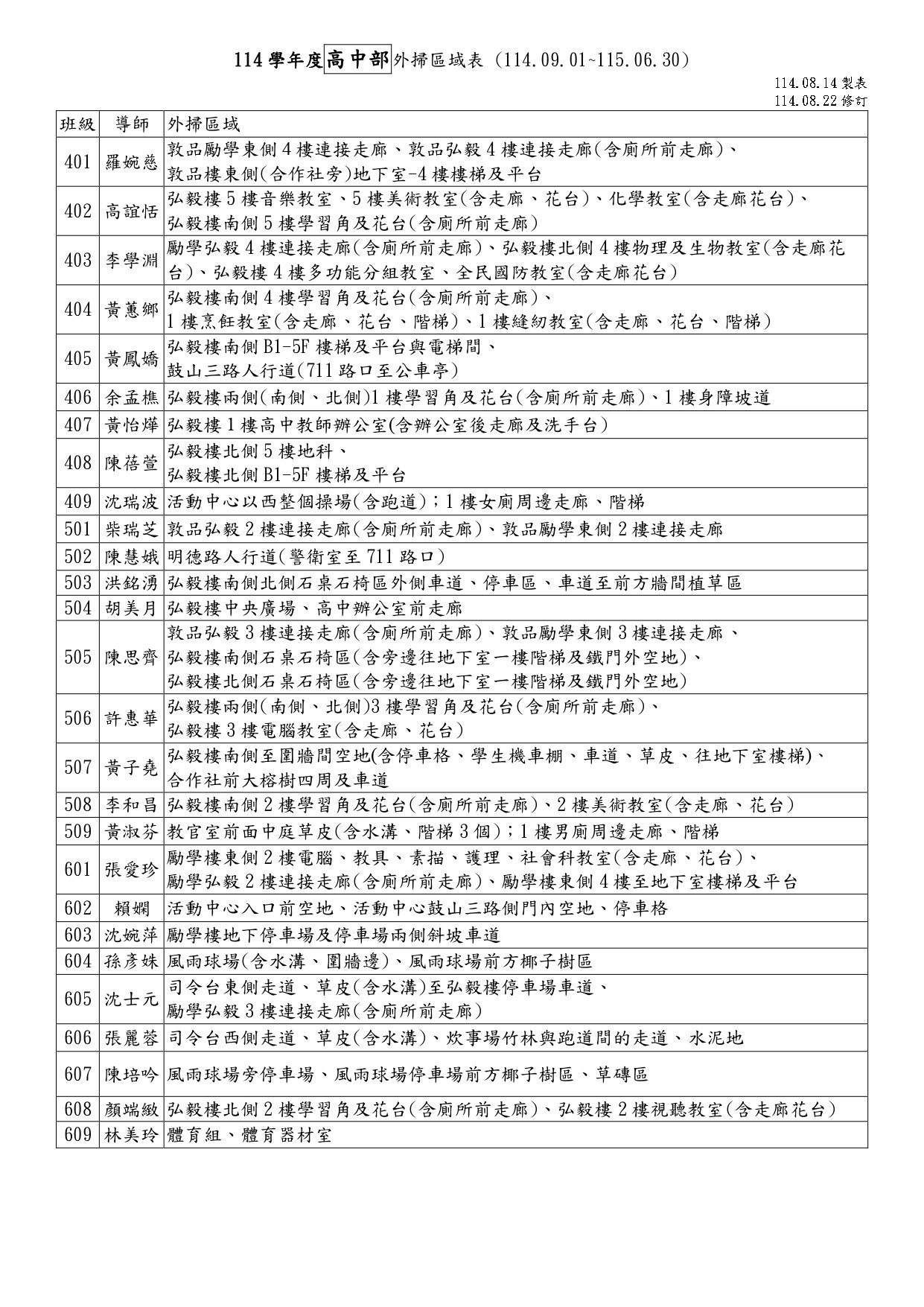 (一) 114學年度班級掃區分配表如下,請各班協助清掃,一同維護校園整潔。
