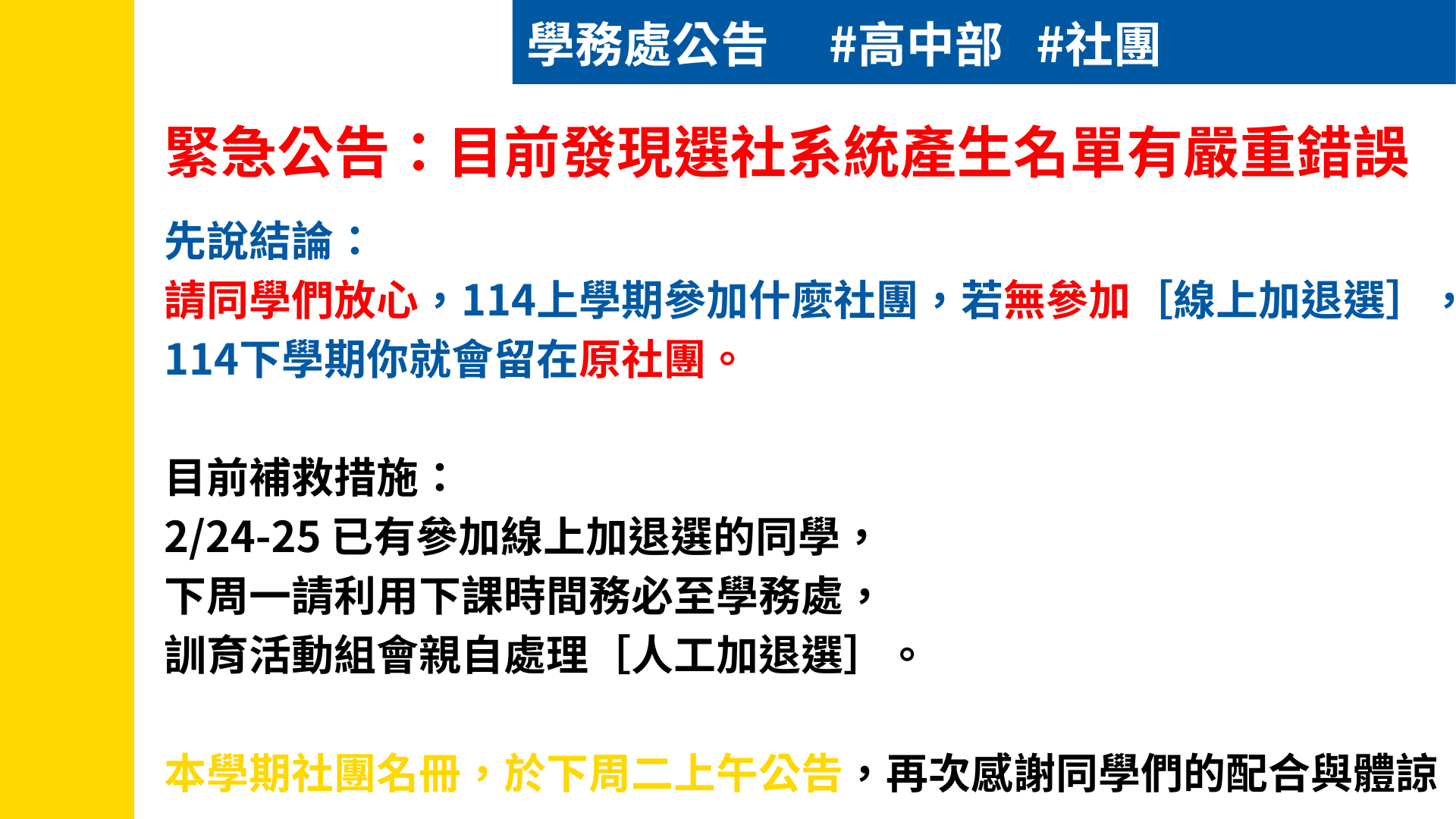[高中部社團]緊急公告:目前發現選社系統產生名單有嚴重錯誤,補救措施說明請詳閱附件。