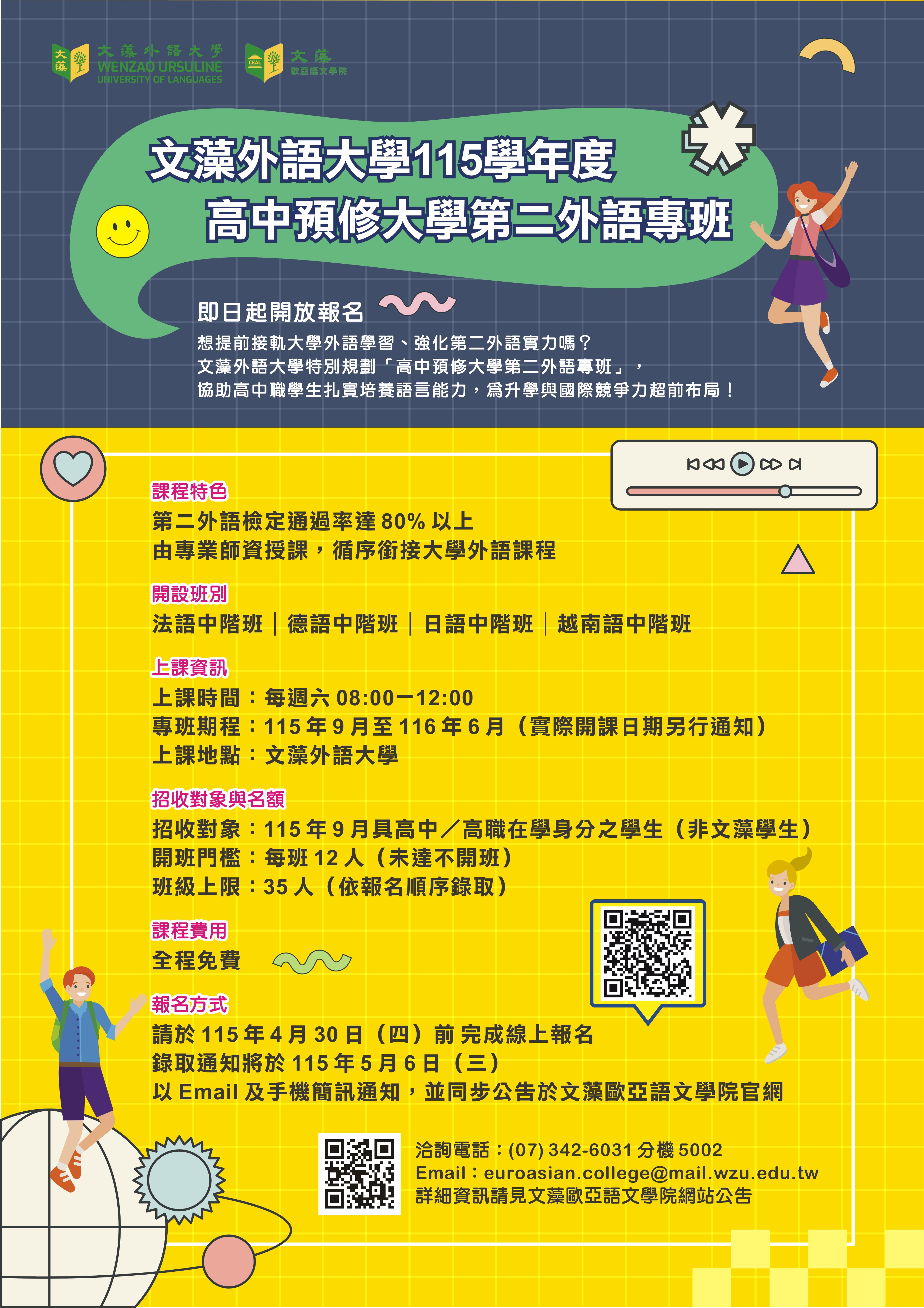 文藻學校財團法人文藻外語大學歐亞語文學院辦理教育部115學年度「高級中學學生預修大學第二外語課程專班」相關資訊