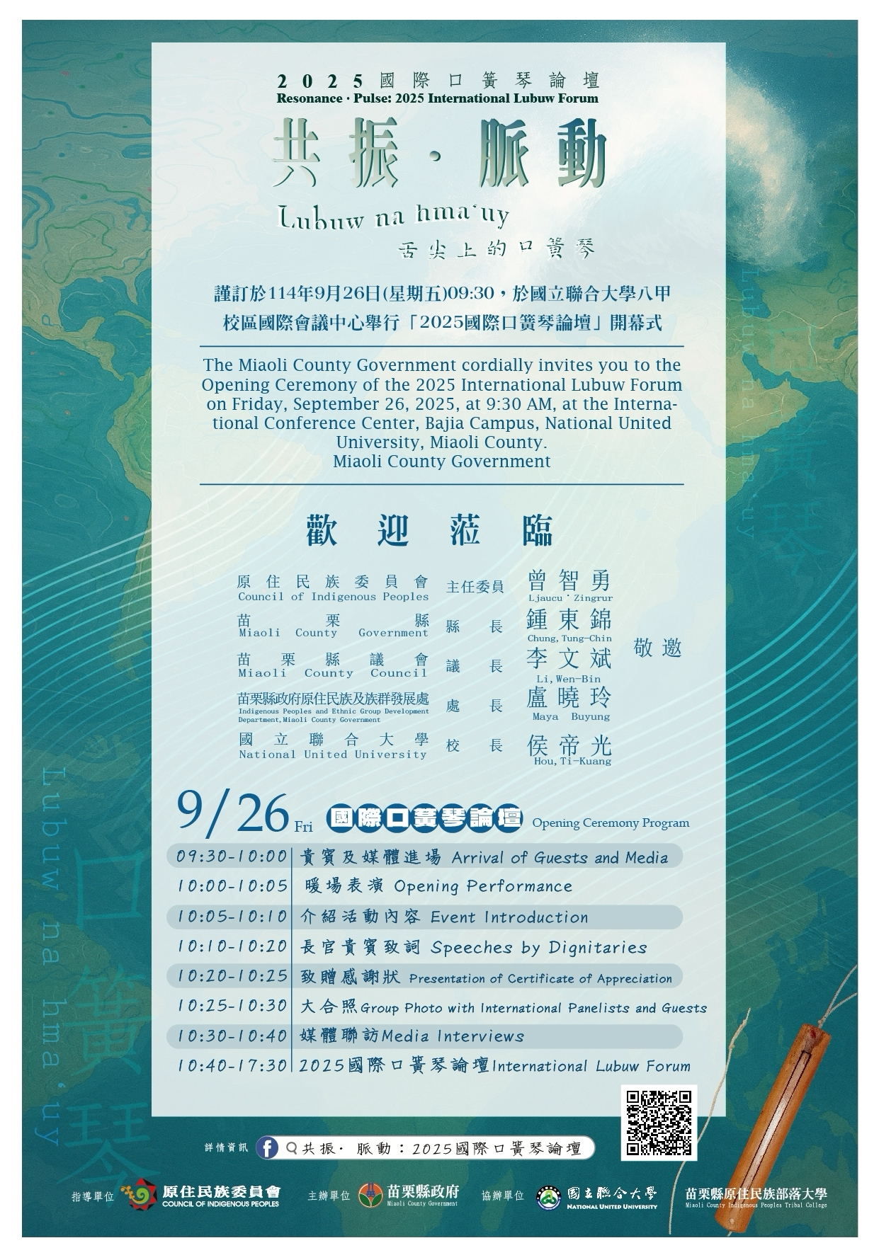 轉知苗栗縣政府辦理「共振· 脈動:2025國際口簧琴論壇-Resonance · Pulse:2025 International Lubuw Forum」系列活動資訊