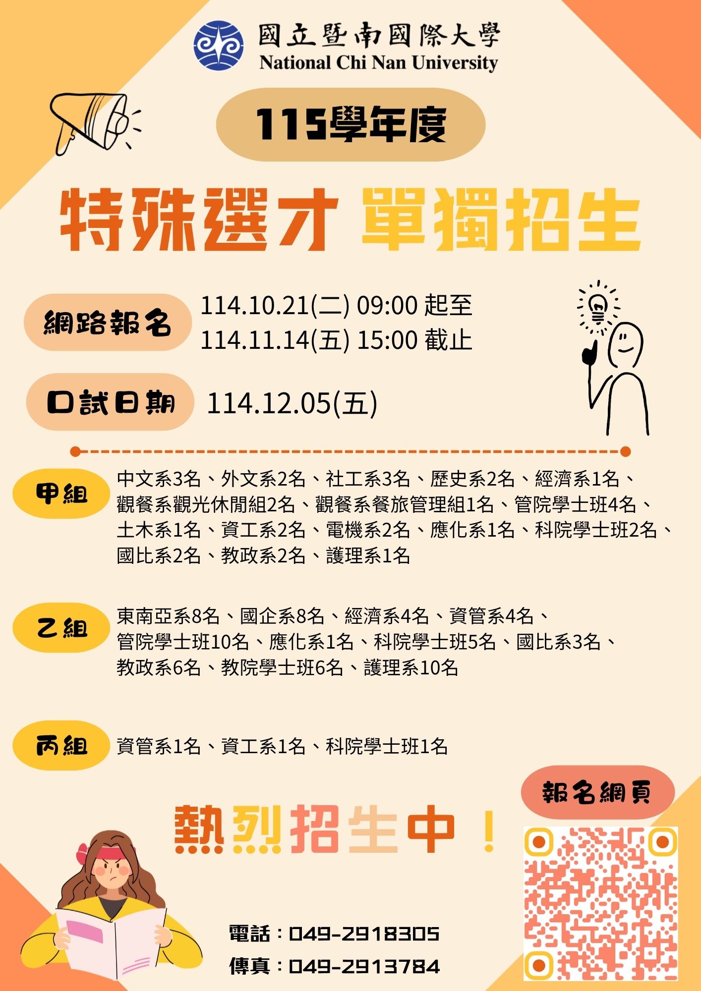 [特殊選才]暨南大學檢送本校115學年度特殊選才單獨招生訊息
