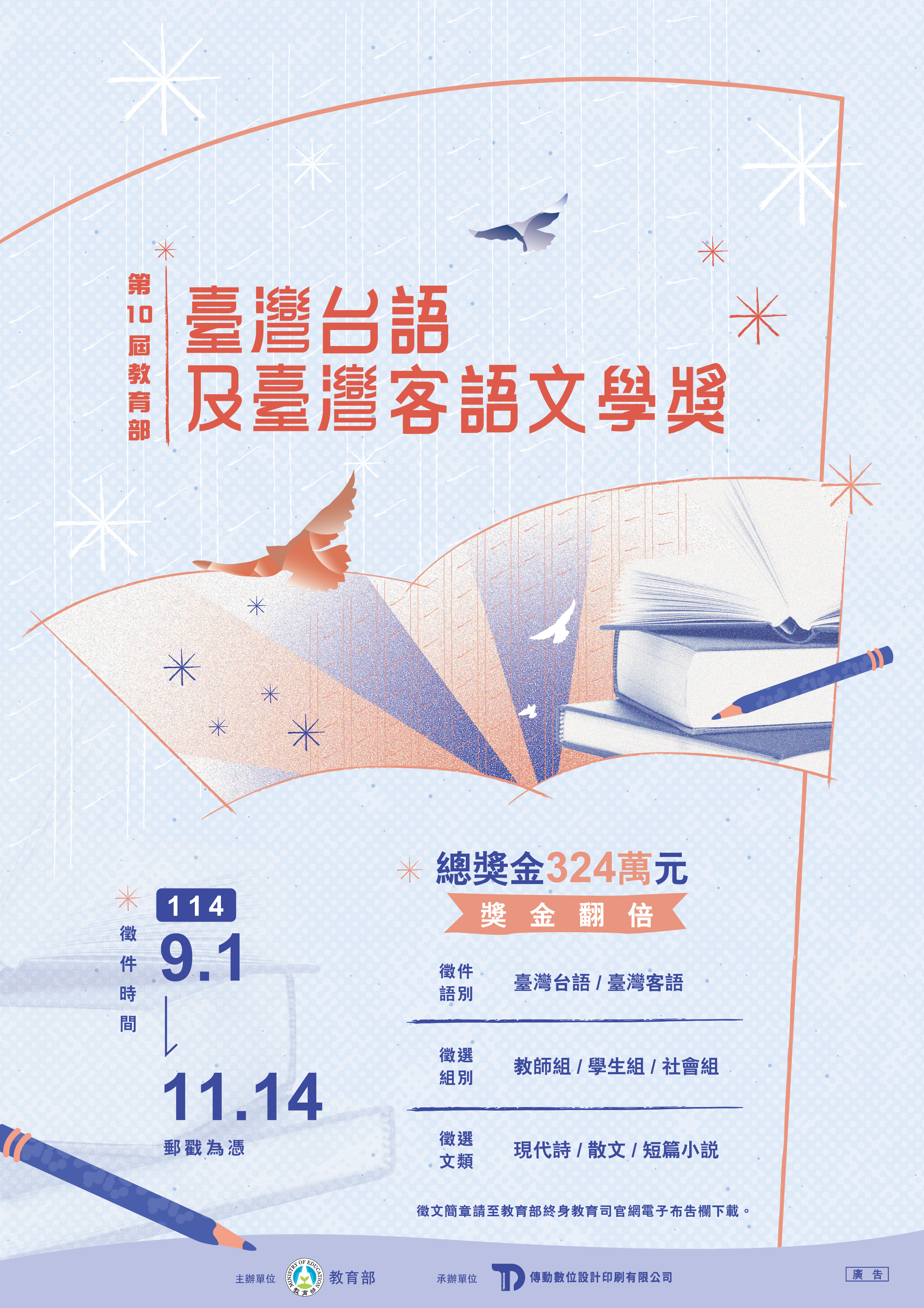 「第十屆教育部臺灣台語及臺灣客語文學獎」徵文時間展延至114年11月14日