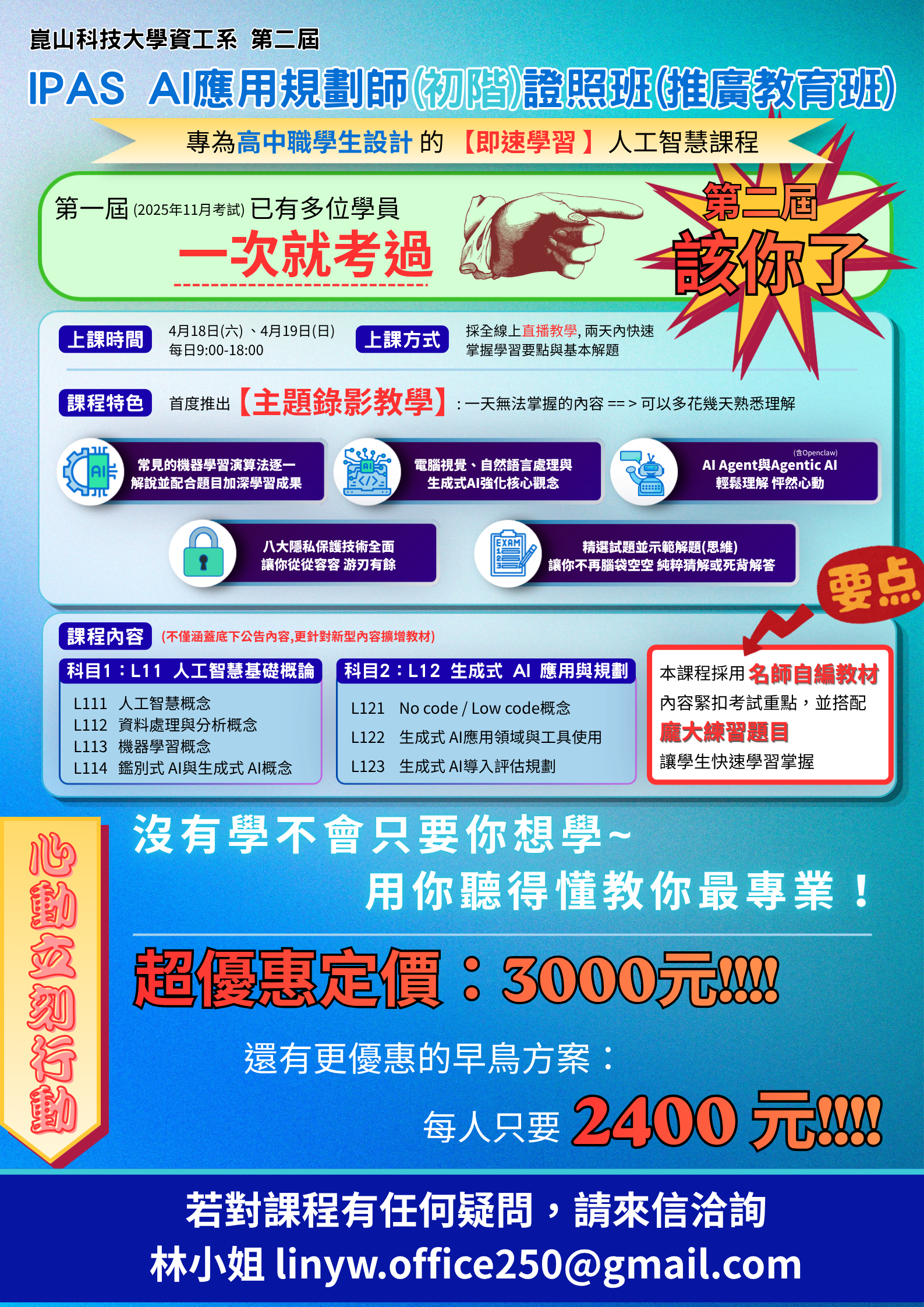 一、為因應國內人工智慧人才需求,本校資訊工程系特開設 「iPAS AI應用規劃師 (初階)證照班」,協助學生打好人工智慧基礎知識,並取得國家推動之IPAS AI應用規劃師(初階)證照,課程詳情如下: